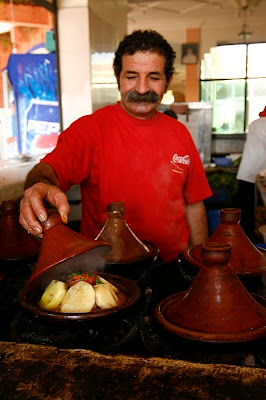 Berber tajines cooking slowly. Berber tajines have round shape, whereas the usual tajine dish is more conical.