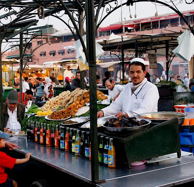 I've been eating on Djemaa el-Fna nightly food market on most evenings and i've kind of developed a favorite food-stall i go to. There are different types of food vendors on the market. Some specialize on grilled meats, some on lamb, some fish and so on. And some on reeling in the tourists, which as mentioned in some earlier post before, are the places you want to keep away from. I've tried the food in many different food-stalls, but i somehow kept coming back to one and the same and now i go there already knowingly.