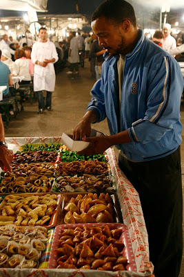 There's also a big variety of sweet snacks sold on the street. I personally don't appreciate sweet food particularly, so i might be a bit biased when it comes to liking/disliking it, but they all seem to be kind of same for me: very sweet and overly greasy. Last time when me and Kaidi were in Fes, we went on a mission to go around in medina and try all kinds of different sweets. We didn't get very far with our testing, the sugar levels alone threatened to give us diabetes. But if you're into properly fried sweets, Morocco is definitely your country. On the Djemaa el-Fna nightly market, there are usually guys walking around with carts loaded with sweets (as on the photo ->), so if you're done stuffing yourself with tajine's, it's time to overdose on sugar.
